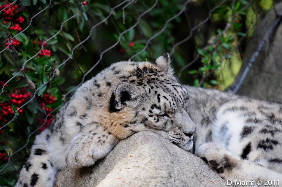 The old adage..of let sleeping dogs lie–think that also applies to napping cats, such as this beautiful Snow Leopard relaxing away on top of a rock!