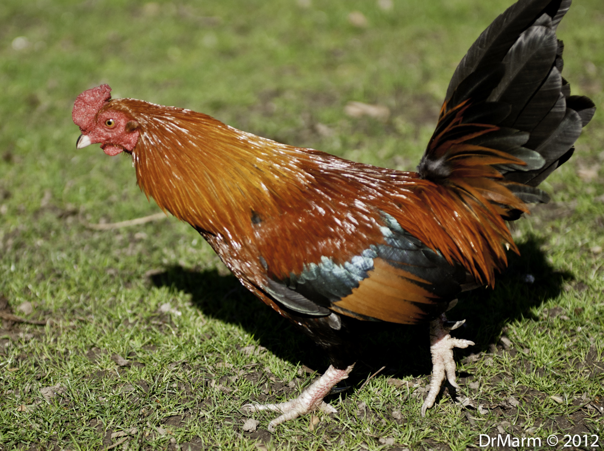 Fair Oaks is a small town nestled between Carmichael and Citrus Heights, near Sacramento, CA. The “Town Square” is a small park with local businesses surrounding two sides. What is most unusual are the feathered friends that roam through out the entire town. Roosters and Hens peck at the grass and root in the shrubbery and come near people–obviously, well fed!